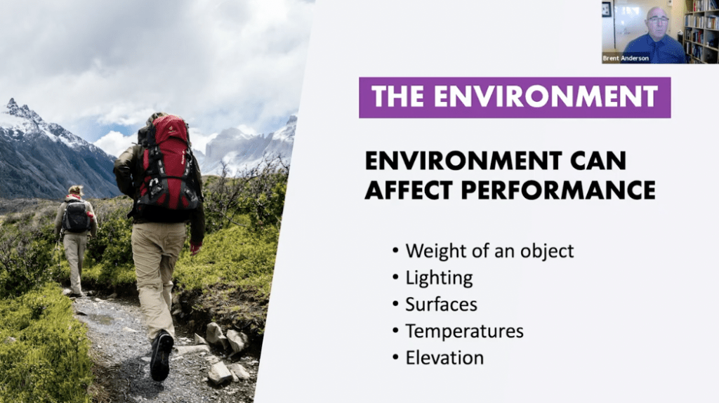 Consider the weight of an object such as the weight of a backpack. Hiking with a 30lb pack will potentially shorten the distance someone can hike compared to hiking without a pack. Or consider lighting – when it gets dark, movement can become more challenging for some individuals. When the darkness of the environment takes away the sense of eyesight, they are relying on their vestibular and proprioceptive systems which may be deficient.