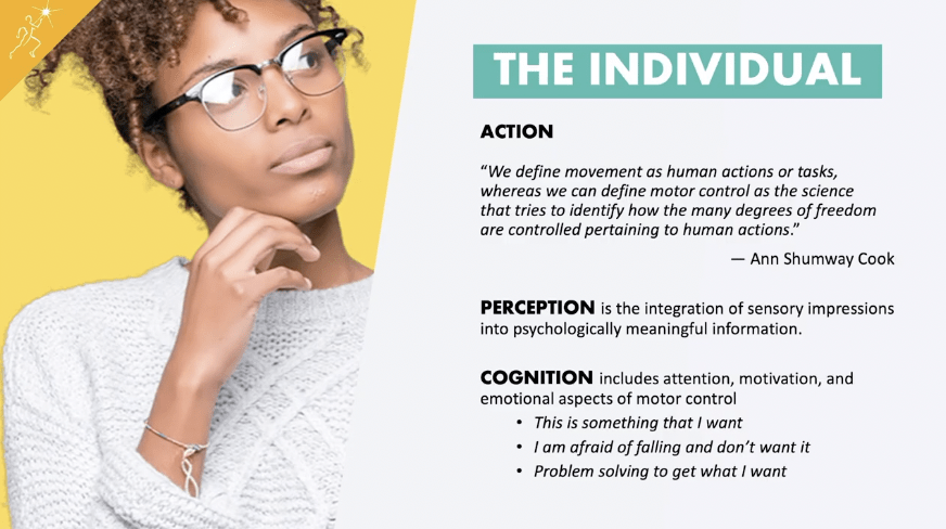 All three aspects of motor control, the individual, the task, and the environment are all important to us as movement teachers and analysts.