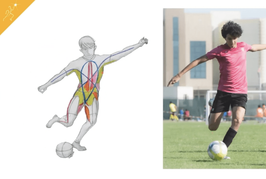 When we look at the dynamic movement of kicking a ball, what are they doing and what muscles must be turned on for the person in the photo to be able to kick the ball? Which fascial trains or slings are being activated or tensioned to be able to have the appropriate amount of control of the trunk so that their leg and body can accelerate the foot through space and kick the ball down the field?